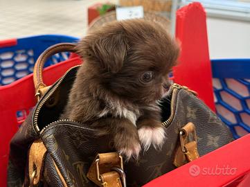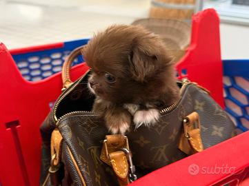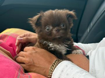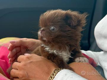 Priscilla (nome indicativo) è questa cucciolina femmina di Chihuahua di 2 mesi di età PICCOLISSIMA, mantello cioccolato a pelo lungo impreziosito da poche e delicate macchie bianche. Morbida come un peluche, è dolce e curiosa, ama farsi coccolare e giocare. Perfetta per chi cerca una piccola amica affettuosa e irresistibile.