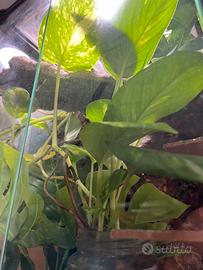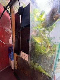Vendo inoltre il suo terrario (exo terra X-tall 30x30x60h cm) con fondo spesso e con possibilità di renderlo bioattivo. Il terrario ha sfondo artigianale con cortecce e rami; includo anche lo sfondo originale. Arredato con piante finte e un pothos in coltura idroponica.