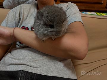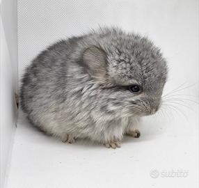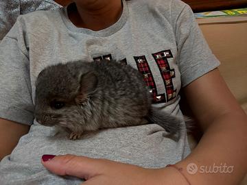 Disponibile cucciolo maschio di cincillà, mutazione standard angora portatore gene Violet ebony e white . Ha 3 mesi , ben socializzato ed abituato ad essere manipolato.