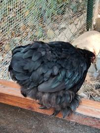 Cocincina nana total black, con splendide sfumature nel piumaggio. Già all'uovo e ottima chiocca. Circa un anno di età, forse qualcosa meno.