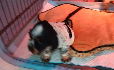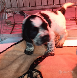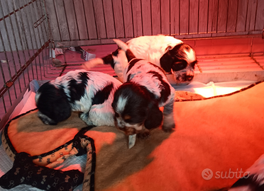 Prenotabili cuccioli di cocker spaniel maschi, uno tricolore cioccolato, due tricolori e uno blu romano nati in casa il 10 dicembre.