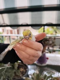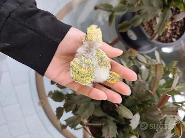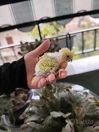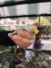 Cocorita da imbecco da allevare a mano allo stecco o alla siringa Ha già il piumino quindi non ha bisogno della luce termica perché può riscaldarsi da solo Disponibile una verde e gialla CIUFFATA Genitori visibili .