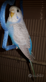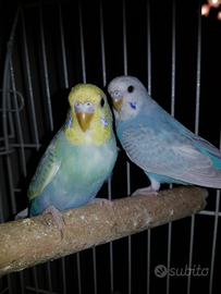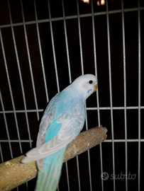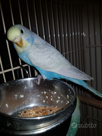 Sono disponibili quattro pulli di cocorita come in foto 1. Cobalto. Mutazione: full body Grey Wing (foto 3) 2. Sky blue. Mutazione: clear wing (ala chiara) faccia gialla tipo I ( foto 2) 3. Sky Blue. Mutazione: opale, full body Grey Wing ( foto 1 e 3) 4. Malva Mutazione opale faccia oro ( tipo II), vicino al pullo della foto 3 ( foto 1 e 3)