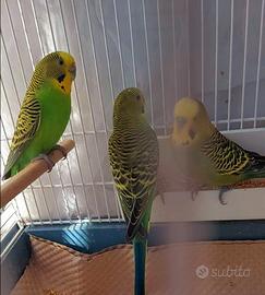 Cocorite, una coppia riproduttiva (maschio verde oliva e femmina verde chiaro) più una figlia verde chiara di pochi mesi