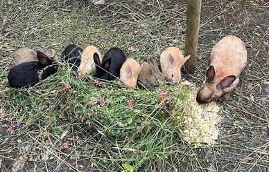 Conigli allevati in garenna all'aperto in pochi esemplari con erba di campo fresca , fieno, erba medica e schiacciato di semi vari Razze miste da bianco nuova zelanda, borgogna , blu , nero.