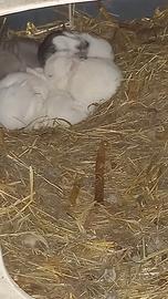 Vendo bellissimi cuccioli di conigli ariete nani madre e padre visibili in foto non mi chiedete il sesso perché ancora sono da svezzare se siete interessati mi contattate e appena sono svezzati mi faccio sapere il sesso 4 bianchi 1 bianco pezzato grigio prezzo in privato solo whatsapp