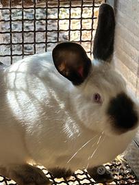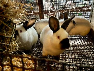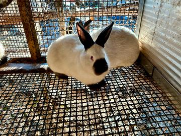 Vendo conigli California in purezza, trattasi di un ottima razza da carne molto prolifica e facile da allevare, sempre se si seguono le buone regole di allevamento sulle quali sarò contento di consigliarvi se vi dovesse servire. Sono disponibili conigli di varie età ed anche coppie non consanguinee. Buon allevamento a tutti :-). Ps.: il prezzo varia dai 20 ai 30 euro in base all' età.