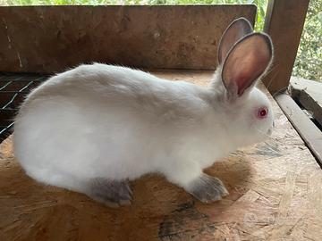 Disponibili conigli razza da carne California con età 5 mesi e 2 mesi, sia maschi che femmine, prezzo 25 euro. Disponibile anche fattrice in gravidanza 50 euro.