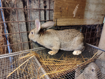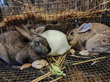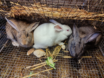 Conigli giganti di 3 mesi, giganti ibridi, incroci molto proliferi, alimentati con verdure di stagione e cereali. Cedo 30 euro l'uno, disponibili 3 coppie.
