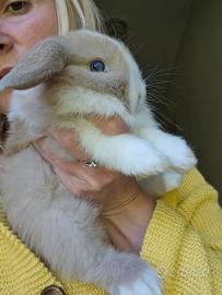 Disponibili coniglietti minilop tutti con occhi blu. Molto giocherelloni e docili. Il primo maschietto orange split extreme, la seconda femmina bianca, il terzo maschietto lilac split extreme. Pronti da inizio maggio