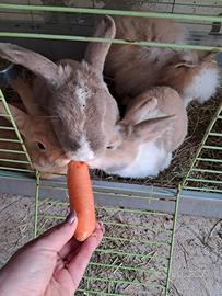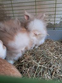 La mamma dei coniglietti è presente in foto è un incrocio ariete/testa di leone mentre il papà è testa di leone. I cuccioli sono nati il 13 dicembre sono già svezzati abituati con i gatti. Conigli da compagnia vivono bene anche in giardino necessitano di un riparo.