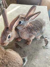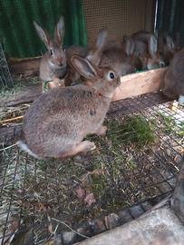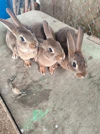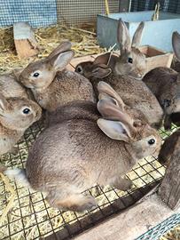 Vendo giovani conigli svezzati da ingrasso, sui 60 giorni dal peso di un kg. 12 euro l'uno. Possibilità di avere soggetti non consanguinei. Sono Leprino di Viterbo, razza pregiata, coniglio estremamente rustico e prolifico, taglia media (sui 3,5kg da adulto)