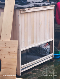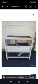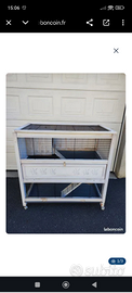 Conigliera a 2 piani. Al primo piano si trova una piccola casetta. Lunghezza 108 cm, profondità 58 cm, altezza 100 cm.. Questa conigliera è stata usata per alcuni mesi, il che spiega le sue condizioni ottime . Acquistata nuova per 385 €. Vendo a 60€