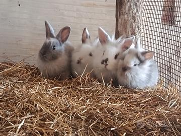Vendo coniglietti, genitori visibili in foto, papà Testa di Leone. 3 maschietti (2grigi e 1 bianco) 2 femmine (bianche)