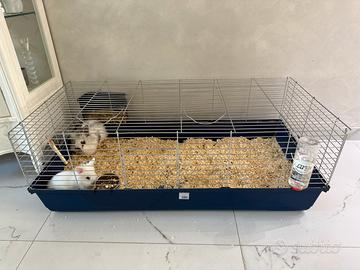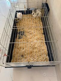 Vendesi coppia di coniglietti Nani il bianco è un maschio e là grigio e bianca è una femmina , compreso gabbia con mangiatoia e beverino , gabbia grande. I conigli sono vaccinati e con pipetta per pulci , zecche e parassiti già messa