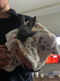 Vendo a malincuore cucciolo di coniglio toy, 2 mesi circa. Colore blu di Vienna, occhi azzurri. Vaccinato e in buonissima salute. Vendo completo di gabbia, accessori, giochi, pellet, fieno e mangime.