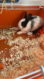 Vendo coniglio nano poiché non ho spazio per poterlo far correre e giocare. Con il coniglio includo gabbia , dispenser fieno e acqua , giochini