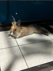Coniglio nano testa di leone sano, di quasi 9 mesi cerca casa preferibilmente con spazio al aperto o una stanzetta allestita per coniglietti, non deve stare mai chiuso in gabbia . Ho anche una gabbia a 2 piani grandina se avete bisogno anche di essa( pagata €70) la faccio a €30 + il coniglietto