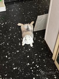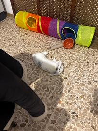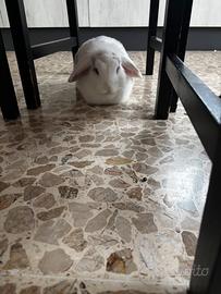 Vendo la mia coniglietta di 9 mesi circa È molto affettuosa e abituata al contatto umano Adora le coccole e una volta affezionata di segue ovunque Non morde Pelo bianco con macchie grigie Insieme vendo gabbia angolare " villa per conigli " con tutti gli accessori Causa trasferimento non posso portarla