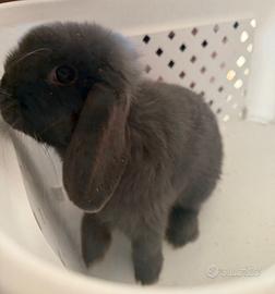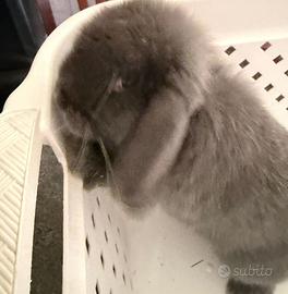 Coniglio ariete di circa 3 mesi blu si cede per motivi di allergia inaspettata. Si cede con gabbia grande, beverino e ciotole. Limitato recupero spese. Coniglio domestico non per scopo alimentare.