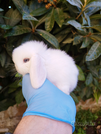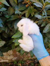 Disponibile in sede cucciolo di coniglietto nano ariete mini lop varietà bianco occhi celesti molto docile e tranquillo abituato al contatto umano possibilità di acquistare kit completo per il coniglietto gabbie mangimi accessori e inoltre informazioni utili su cura alimentazione igiene
