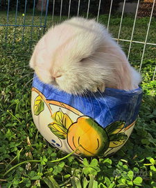 Disponibile splendido coniglio ariete di razza FEMMINA dal bellissimo mantello bianco con occhi azzurri, dolcissimo e cresciuto con cura.