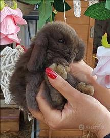 Bellissimo coniglietto con papà minilop e mamma ariete nano, colorazione cioccolato, ha 2mesi, viene ceduto con libretto sanitario, trattamento anticoccidi, vaccino annuale tutto compreso nel prezzo. Se interessati contattatemi. Allevamento amatoriale con conigli felici e ben socializzati abituati a vivere liberi in casa e in giardino.