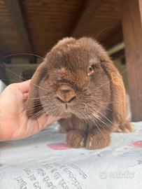 Coniglio ariete nano di pura razza. Adulto color cioccolato Maschio Trattamento antiparassitario e coccidiostatico eseguito. Adulto di due anni