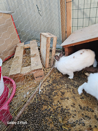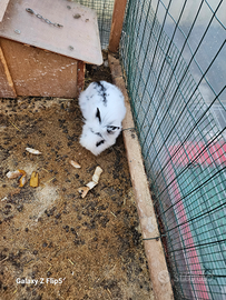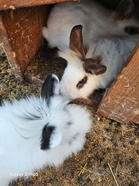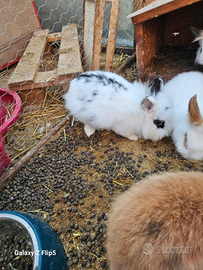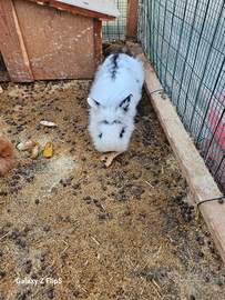 Cedo coniglio bianco e nero a pelo lungo. Coniglia bianca e marrone pelo misto.