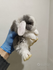 Disponibile in sede cucciolo di coniglietto nano ariete mini lop varietà pan-da bicolor bianco e grigio molto docile e tranquillo abituato al contatto umano possibilità di acquistare kit completo per il coniglietto gabbie mangimi accessori e inoltre informazioni utili su cura alimentazione igiene