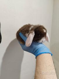 Disponibile in sede cucciolo di coniglietto nano ariete mini lop varietà pan-da bicolor bianco e cioccolato molto docile e tranquillo abituato al contatto umano possibilità di acquistare kit completo per il coniglietto gabbie mangimi accessori e inoltre informazioni utili su cura alimentazione igiene Pagine social Piccolo Zoo Villaricca