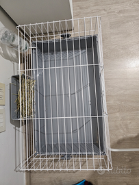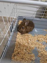 Insieme al coniglietto vendo la gabbia (75×45 cm), la borraccia da cui beve e tutto l'occorrente che serve come il mangime, la lettiera e il fieno.