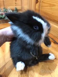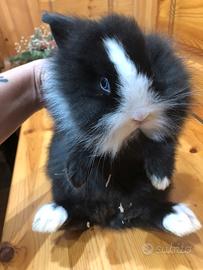 Disponibile coniglio nano minitoy split nero e bianco a pelo lungo femmina occhi azzurri, mamma coniglio nano e papà minilop, non diventano come i conigli olandesi o conigli nani, loro hanno le guanciottone e le orecchie corte e come carattere sono più docili perché prendono molto il carattere del papà. Per chi fosse interessato mi contatti pure al 3895590965.