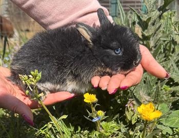 Coniglio olandese nano con occhi azzurri. Viene ceduto con libretto sanitario con attestante vaccinazione. È presente anche la foto dei genitori!