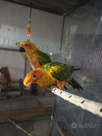 Vendo coppia di Conuri del Sole di 4 mesi, cresciuti allo stecco, già cessati e svezzati. Sani, ben socializzati e abituati al contatto umano. Maschio e femmina, ceduti esclusivamente insieme, con documentazione CITES in regola