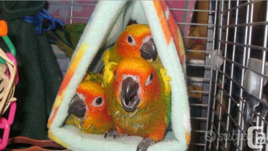 Pappagalli conuri del sole (aratinga solstitialis) e parrocchetti veloci (latamus discolor) allevati a mano, buonissimi e ottimi da compagnia.