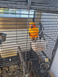 Conuro del sole allevato a mano fin dai primi giorni di vita adorabile e giocarellone di 2 anni ,molto rosso sul petto vendo per mancanza di tempo da dedicare, voliera compresa nel prezzo con cites