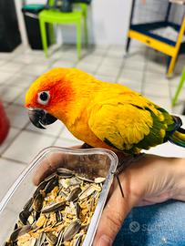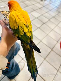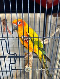 Vendo conuro del sole di circa 1 anno, anellato e completo di documenti CITES, compreso di gabbia grande (circa 1,70 di altezza) e una piu piccola per il trasporto.