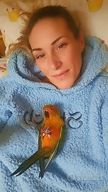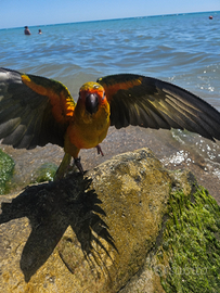 Vendo conuro del sole di 7 mesi allevato a mano 300 Con gabbia compresa di tutti gli accessori 350 prezzo trattabile contattare al 3312244747