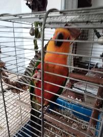 Conuro yandaia maschio di quattro anni allevato a mano, bellissimo e super affettuoso, purtroppo i padroni sono anziani e non possono più tenerlo... Inclusa gabbia con supporto.