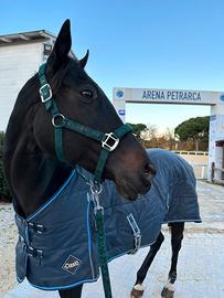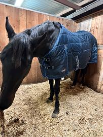 Vendo coperta da box 145 cm 200gr, usata solo un mese, praticamente nuova. Vendo lavata e disinfettata. Possibile ritiro a mano ad Arezzo.