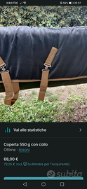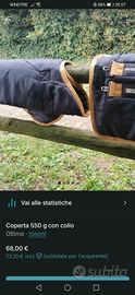 Coperta da box igienizzato e lavata. Misura 128 con collo. 550 grammi, bella calda. Utilizzata sul cavallo tosato prima di essere lavata in laboratorio.