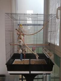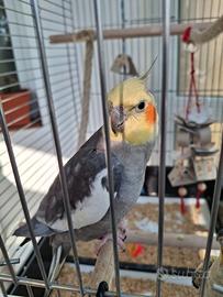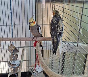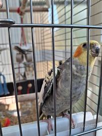 Vendo 2 calopsiti maschi, allevati a mano, annellati, socievoli e abituati al contatto con le persone. Uno di un anno e due mesi e l'altro di 7 mesi, abituati a stare insieme. Allegri, giocosi, canterini e imitatori. Vendo completo di gabbia nuova, con piedistallo a rotelle L75xP45xH82 (con piedistallo H 68, totale H 149), cibo, accessori e giochi e tutto l'occorrente. Non Vendo singolarmente. Non spedisco. Vendo a 100 euro tutto insieme: 2 pappagalli, gabbia completa di accessori e tutto l'occorrente. Vendo per mancanza di tempo da dedicare.