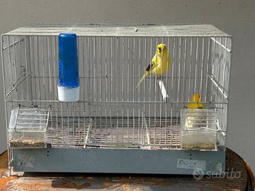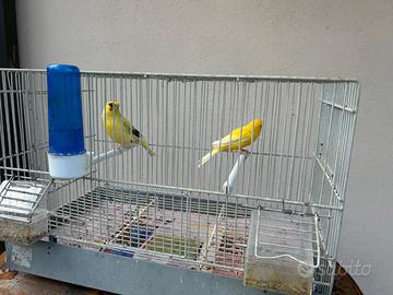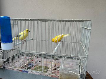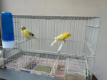Vendo coppia canarini 2025 . Maschio giallo intenso / femmina gialla pezzata gloster Vendesi anche separatamente. 10 all' uno . Vendo anche la gabbia a 10 euro se serve