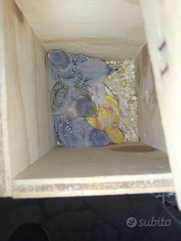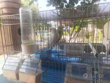 Cedo coppia di cocorite riproduttiva (foto dell ultima nidiata), composta da maschio albino x femmina clearbody. Possibilità di cedere la coppia con gabbia. X info contattatemi in pvt