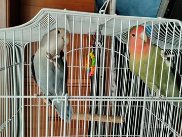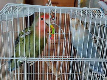 VENDO 2 PAPPAGALLI INSEPARABILI DI POCO PIU' DI 2 ANNI AL COSTO DI 65 EURO. LI CEDO EVENTUALMENTE CON GABBIA DI 1 METRO, ACCESSORI E MANGIME RIMASTO AL COSTO TOTALE DI 95 EURO.
