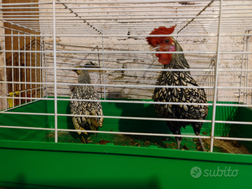Vendo coppia composta da gallo e gallina colore argento orlato nero. Gallo nato a maggio 25, gallina luglio 25. Sono entrambi portatori oro, cioè alcuni pulcini nasceranno argento orlato nero, alcuni oro orlato nero e raramente limone orlato nero. PREZZO NON TRATTABILE, NON SPEDISCO NON TRASPORTO. Il prezzo è per entrambi insieme.
