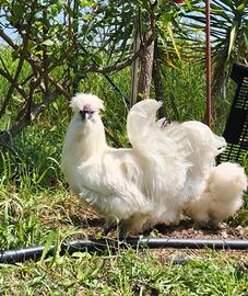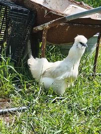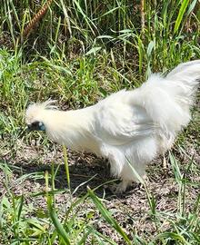 Vendo tre esemplari giovani di moroseta colorazione bianca con barba nati a fine estate scorsa da cova naturale. Sono disponibili due galli e una gallina. Ottime caratteristiche di razza, genitori visibili in foto, pronti alla riproduzione. Per ulteriori foto e/o informazioni sono disponibile.
