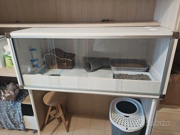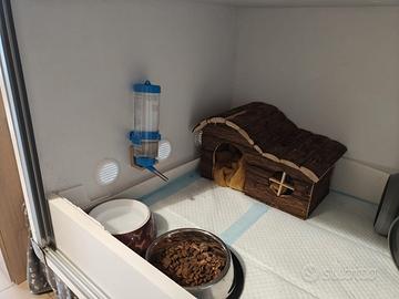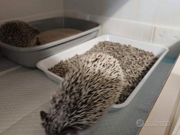 Cedesi coppia di giovanissimi ricci africani con teca in truciolare nobilitato spesso 1,80 cm misure della teca 115 cm X 60 cm alta 49 cm. Tre prese d' aria sulla parete laterale sinistra e sul tetto a destra, prese protette internamente ed esternamente, angolari rinforzati. Giunzioni impermeabilizzate con silicone sanitario bianco. Apertura frontale con fogli di policarbonato per la massima visibilità, guide scorrevoli in alluminio, quella in basso protetta da un listello sempre in truciolare nobilitato alta 10 cm. I fogli di policarbonato sono comodamente toglibili per una facile pulizia. Sul fondo è posizionato un foglio, che sormonta sulle pareti, di polionda bianco, robusto ed impermeabile, facilmente lavabile e facilmente rimovibile per una pulizia a fondo o per la sostituzione, con minima spesa, quando e se necessario. A corredo casetta in legno e biberon per l acqua nel caso debbano per restare soli per un paio di giorni.