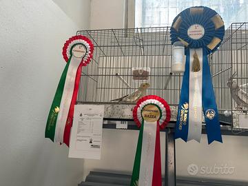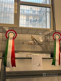 Come da titolo disponibile coppia di calopsite riproduttiva, maschio pezzato portatore di lutino e faccia bianca per femmina pezzata pelata, al momento stanno finendo di svezzare gli ultimi 2 pulli di una covata da 5. I nostri pappagalli sono tutti selezionati infatti come si puo vedere dalle foto hanno vinto varie mostre, in foto anche uno dei loro figli che ha vinto il primo posto all'ultimo campionato regionale. Per informazioni contattatemi su whatsapp. No perditempo